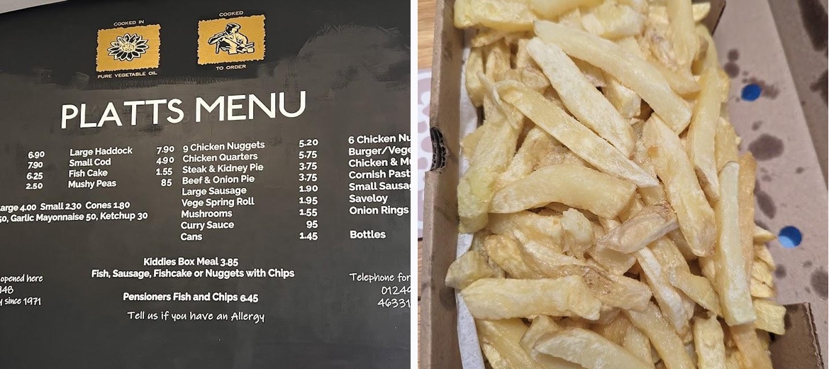 Welcome to Platts, your go-to destination in Chippenham for delicious, traditional fish & chips. Located at 4 Sheldon Rd, we offer a casual dining experience perfect for lunch or dinner, with options for kerbside pickup, delivery, and takeaway. Our menu features fresh, crispy cod and other favorites, served alongside oversized portions that are ideal for sharing. Enjoy a friendly atmosphere where families are welcome, with a special kids' menu available. With wheelchair-accessible seating and convenient free street parking, Platts is committed to providing a memorable dining experience. Join us today to savor the best of British fast food!The portions at Platts surprise most diners, often described as huge. Many patrons suggest sharing a large order of chips, which easily serves multiple people without waste. The friendly staff consistently receive praise for their honesty about portions and cooking methods, making the entire experience more enjoyable. Freshness is key here, as everything is cooked to order, ensuring each dish is hot and flavor-filled. Customers also appreciate that the establishment uses pure vegetable oil, catering to those with food sensitivities. The casual atmosphere invites everyone in, from local regulars to newcomers eager to try the lineup of traditional British fare.